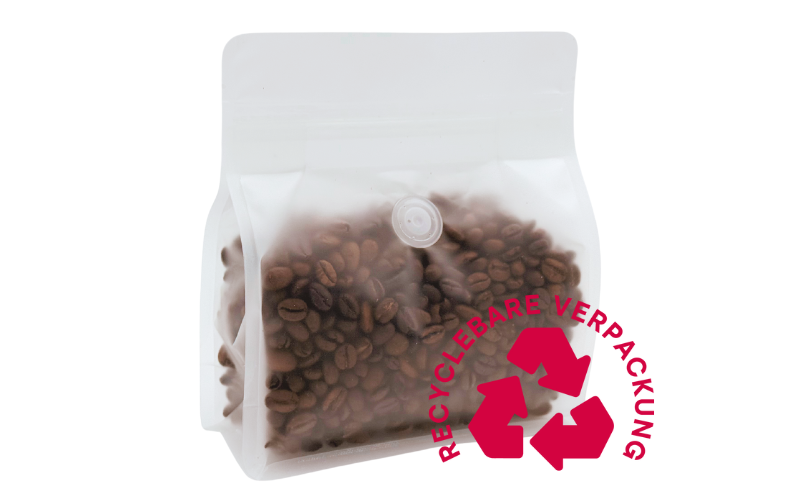 Als Material Papierverbund oder Folie (recyclingfähig ♺), wahlweise mit Top- oder Front Zipper