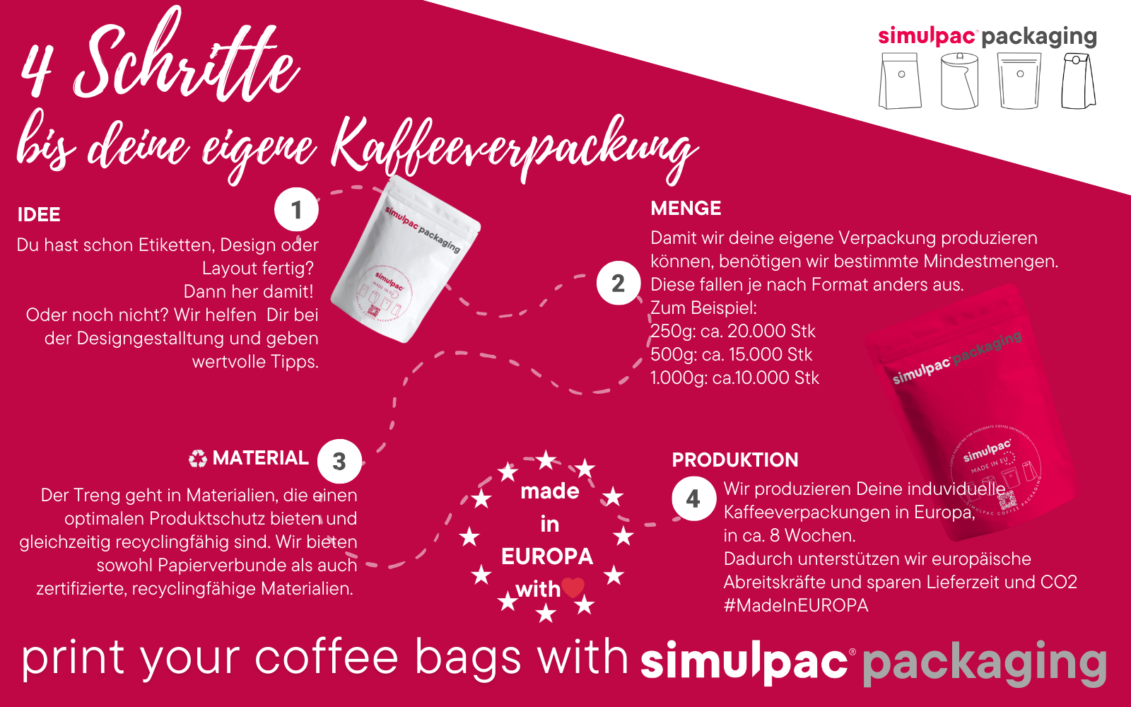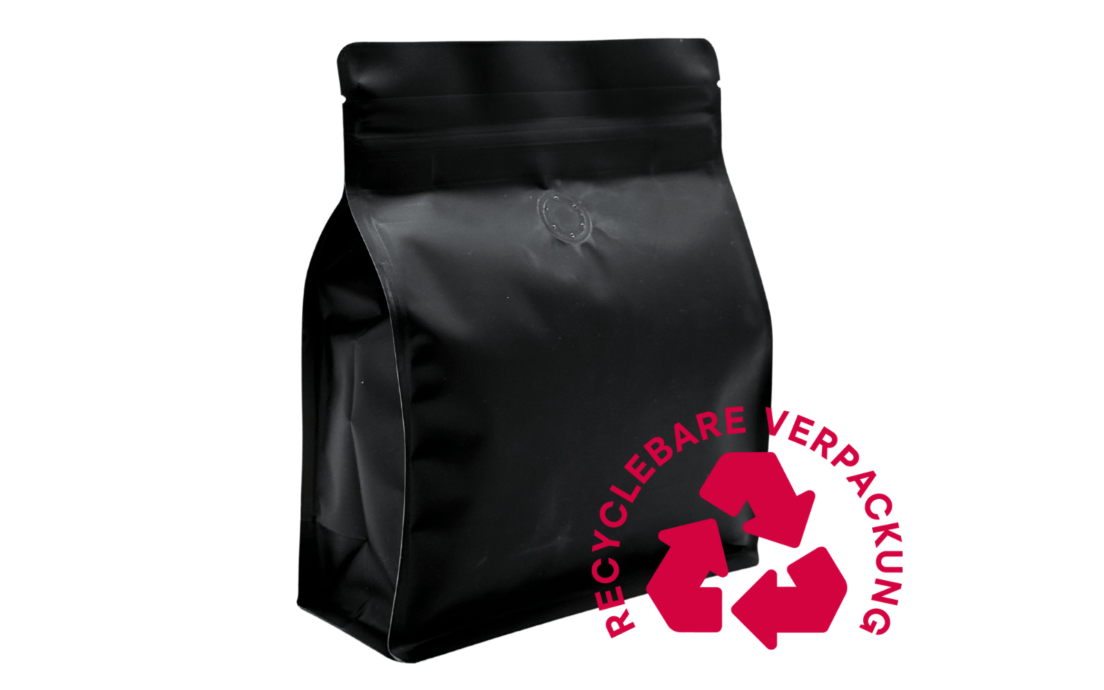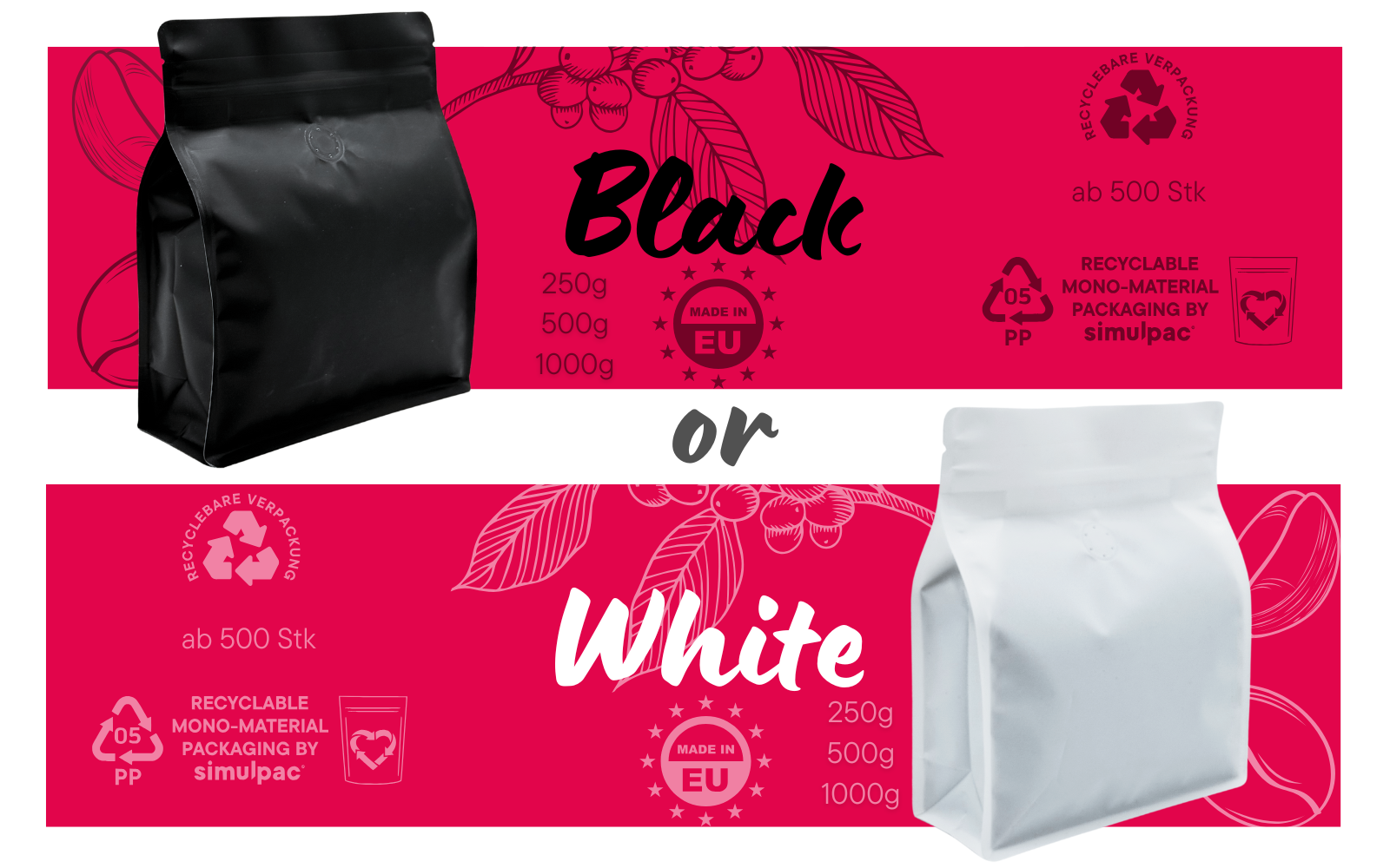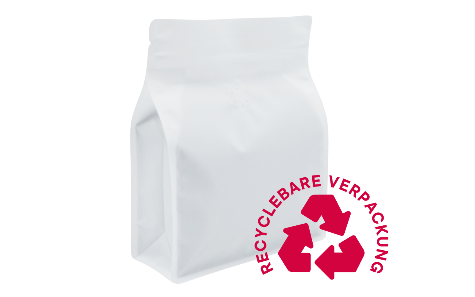 Als Material Papierverbund oder Folie (recyclingfähig ♺), wahlweise mit Top- oder Front Zipper